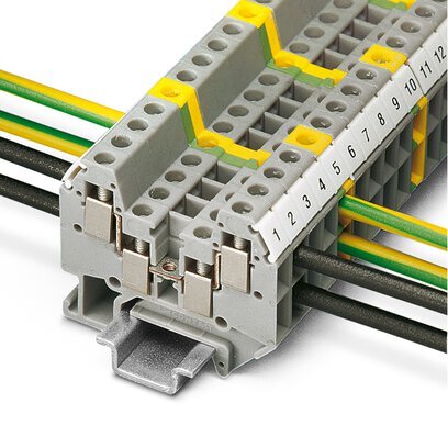 Заземляющая клемма, При монтаже в ряд проходных клемм для напряжения изоляции >320 В необходимо установить крышку, количество точек подсоединения: 4, тип подключения: Винтовые зажимы, cечение: 0,14 мм2 - 1,5 мм2, тип монтажа: NS 15, цвет: желто-зел.