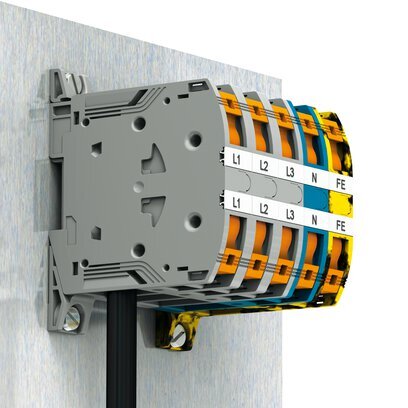 Клемма для высокого тока, номинальное напряжение: 1000 В, номинальный ток: 232 A, количество точек подсоединения: 2, полюсов: 1, тип подключения: Подключение PowerTurn, 1. ярус, cечение: 25 мм2 - 95 мм2, тип монтажа: NS 35/15, цвет: cерый