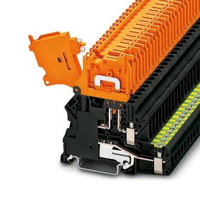 Клемма с рычажными размыкателями, номинальное напряжение: 500 В, номинальный ток: 20 A, тип подключения: Винтовые зажимы, Расчетное сечение: 2,5 мм2, cечение: 0,14 мм2 - 6 мм2, монтаж: NS 35/7,5, NS 35/15, цвет: черный / оранжевый